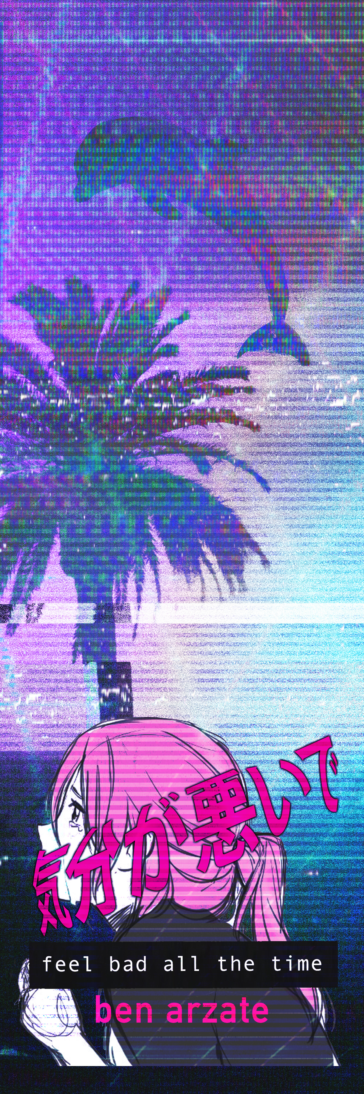 Anyway, I put on Poolsuite FM at Daphne’s recommendation, to immerse, and decided to take an emotional approach to the prompt, while she came up with some striking riffs on the “crying girl” trope. Because it’s an intentionally lo-fi aesthetic, the struggle was in balancing it so it’d look eye-catching and unpolished. I placed Daphne’s crying girl at the foreground very little blending so it’d look like it was cut-and-pasted right out of a screencap, glitched up the backdrop, and threw in a random-ass dolphin hopping over a palm tree for good measure. I believe the text says something like “I Feel Sick,” to complement Ben’s Feel Bad All The Time branding. I don’t know how true to the vaporwave aesthetic it actually ended up being, but I adore that it’s campy/ridiculous and very melancholy.